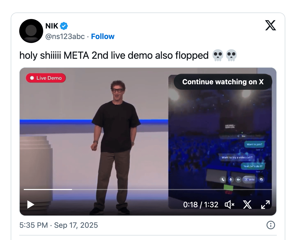 Zuck’s AI-powered Ray-Bans flopped so hard during their live demo you could almost hear the investor panic through the livestream. (Not to be outdone, another product demo crashed right after.)